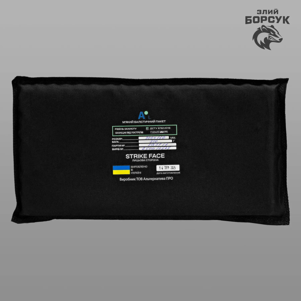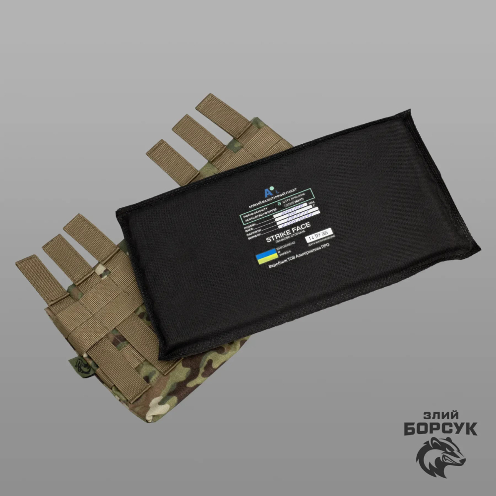 Балістичний пакет або м'який бронезахист – надійний засіб для захисту від уламків та куль, що забезпечує високий рівень безпеки завдяки комбінації синтетичного кевлару та високомолекулярного поліетилену (НВМПЕ). Захист відповідає 1 класу ДСТУ 8782:2018 та ефективно протистоїть снарядам калібру 9 х 18 мм (Makarov) і 9 х 19 мм (Luger). Пакет має розміри 300 х 150 мм та важить лише 300 грам, що робить його зручним у використанні.