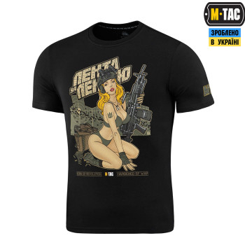 На принті зображена приваблива дівчина в стилі Pin-Up, що є уособленням краси та сили характеру. Зверху принта розміщений напис “Лента за лентою” - слова з відомої пісні, що стала символом незламності українського визвольного руху. Так само як і в пісні, дівчина тримаючи в своїх руках кулемет М249, готова зайняти місце пораненого воїна, аби завдати нищівного удару противнику.