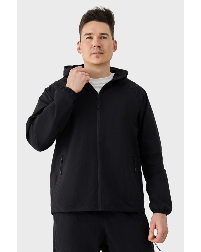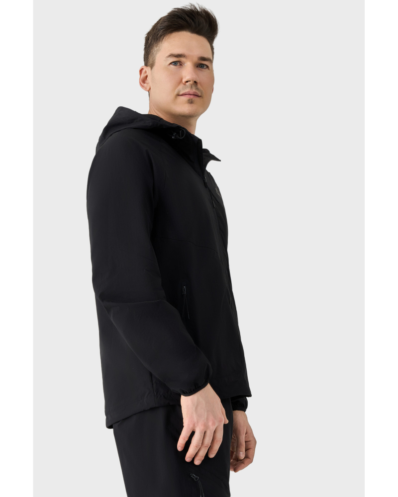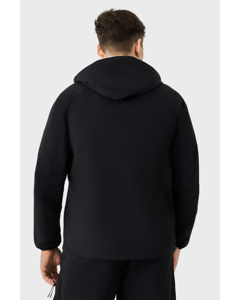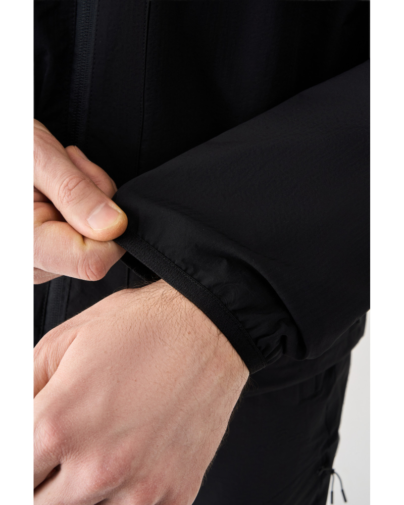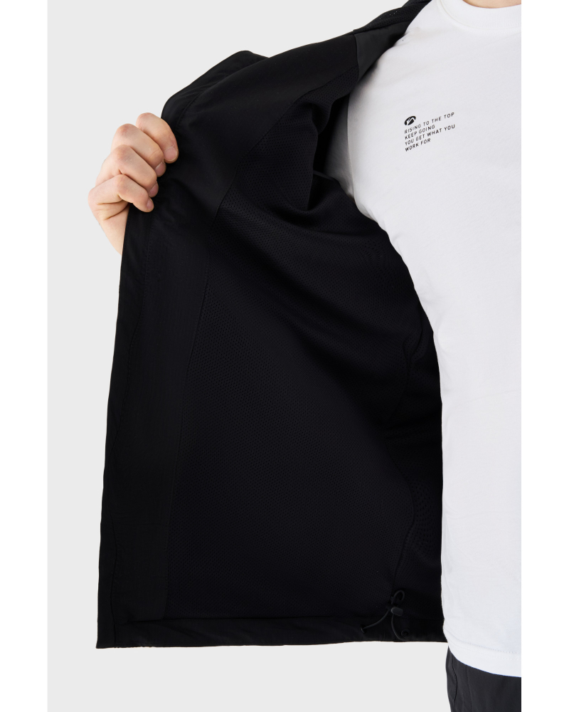 Кофта оснащена цілісним капюшоном, що забезпечує захист від вітру. Резинка по низу виробу формує акуратний силует і сприяє кращій фіксації під час руху. Дві зовнішні бічні кишені, захищені водонепроникними блискавками, дозволяють безпечно зберігати необхідні речі, а дизайнерські елементи на плечах підкреслюють фірмовий стиль бренду.