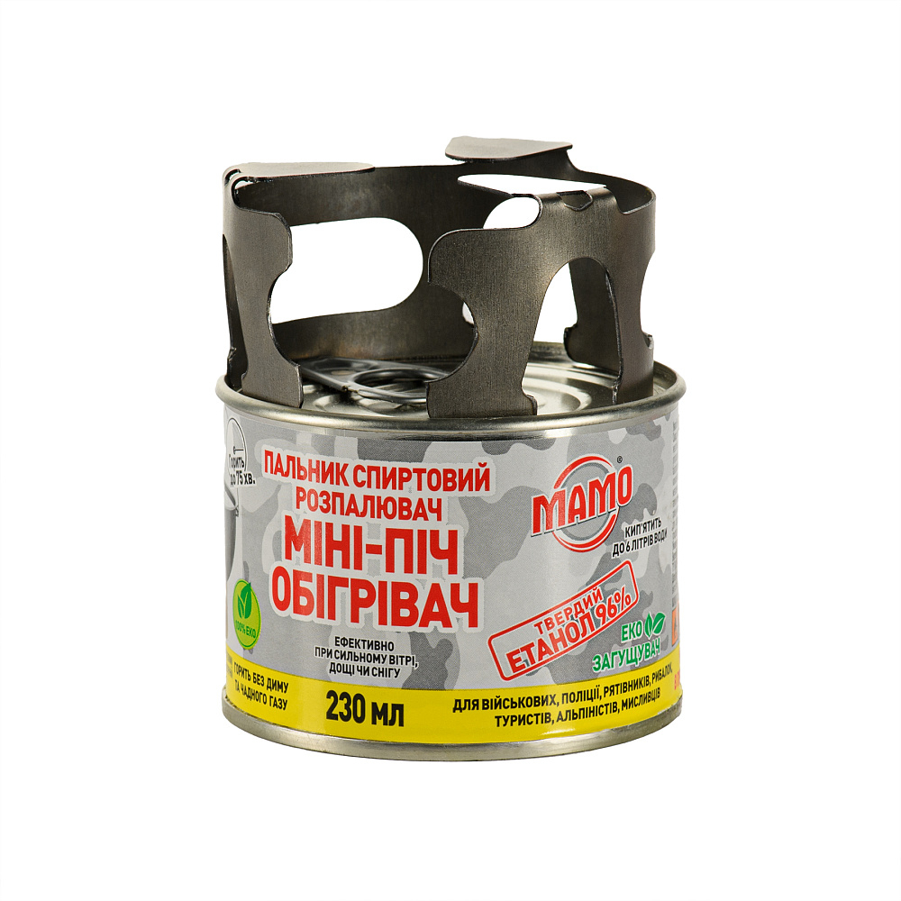 - Спиртовий пальник міні-піч обігрівач МАМО, 230мл - горить 55-75 хвилин, кип'ятить до 6 літрів води.