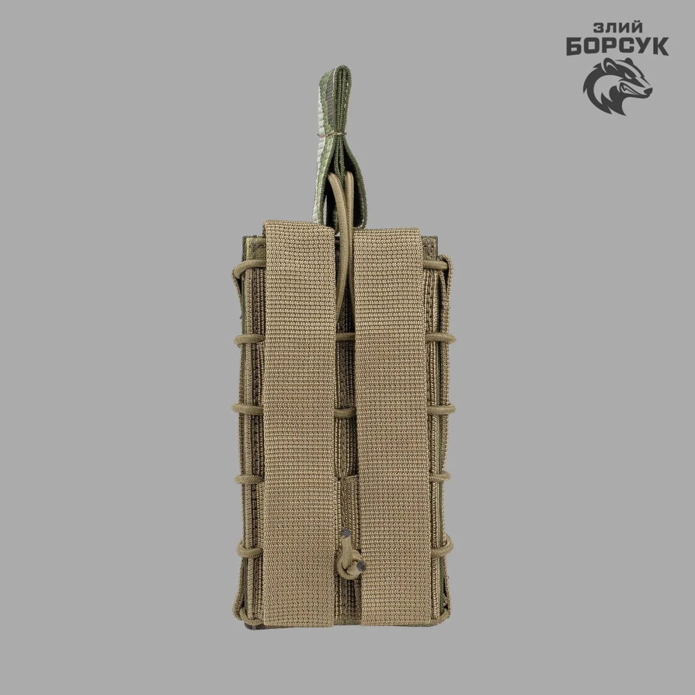 Підсумок під магазини на 1 ріжок відкритий (м’який), завдяки унікальній конструкції, надійно фіксує магазин, запобігаючи його випаданню. Але варто вам докласти невеликих зусиль для вилучення магазину і він одразу опиняється в руці, адже робоча поверхня захвату залишається доступною при знаходженні магазину в підсумку. Це значно прискорює перезарядку і робить маніпуляції по зміні більш ефективними і швидкими. Система стяжок дозволить використовувати даний підсумок для зберігання магазинів АК, АКМ, AR калібром 5,45; 5,56; 7,62 на 30-45 патронів. Даний підсумок м’який і не має пластикових вставок, але системи стяжок міцно тримають ріжки.