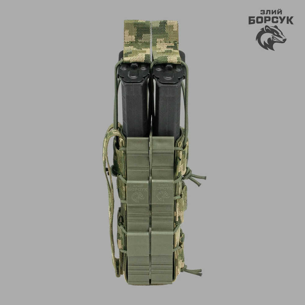 Підсумок під магазини на 2 ріжка відкритий, завдяки унікальній конструкції надійно фіксує магазин, запобігаючи його випаданню. Але варто вам докласти невеликих зусиль для вилучення магазину і він одразу опиняється в руці, адже робоча поверхня захвату залишається доступною при знаходженні магазину в підсумку. Це значно прискорює перезарядку і робить маніпуляції по зміні більш ефективними і швидкими. Система стяжок дозволить використовувати даний підсумок для зберігання магазинів АК, АКМ, AR калібром 5,45; 5,56; 7,62 на 30 патронів. Даний підсумок твердий і має пластикові вставки.