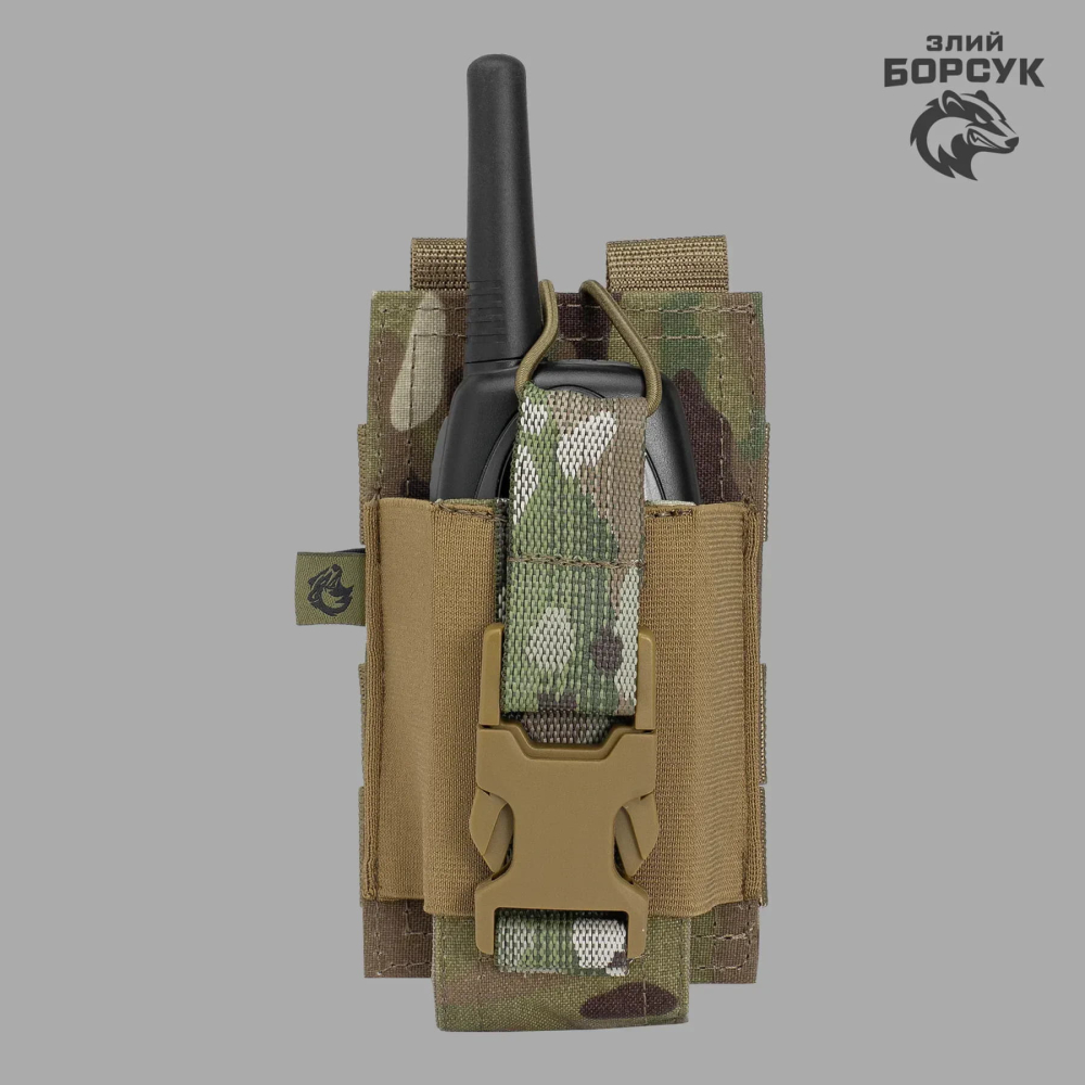 Підсумок під рацію (відкритий), така конструкція підсумка забезпечує доступ до основної панелі управління портативної радіостанції (кнопка РТТ, перемикачі каналів та звуку). Кнопка РТТ та мікрофон залишаються відкритими, що дозволяє використовувати радіостанцію без гарнітури (при розміщенні підсумка на плечі розвантажувальних систем). Бокові частини підсумка мають еластичні резинки, а зверху міцні резиниві шнури, тим самим даючи можливість носити у ньому моделі рацій різні між собою за шириною та висотою. Застібається підсумок на фастекс, забезпечуючи надійне розміщення, запобігаючи випаданню.