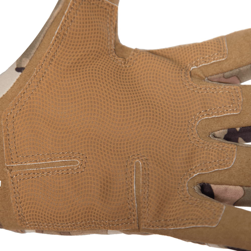 Зі сторони долоні, рукавички вироблені з синтетичної шкіри з антиковзкою накладкою, що нададає вам краще зчеплення з поверхнею при роботі зі спорядженням.