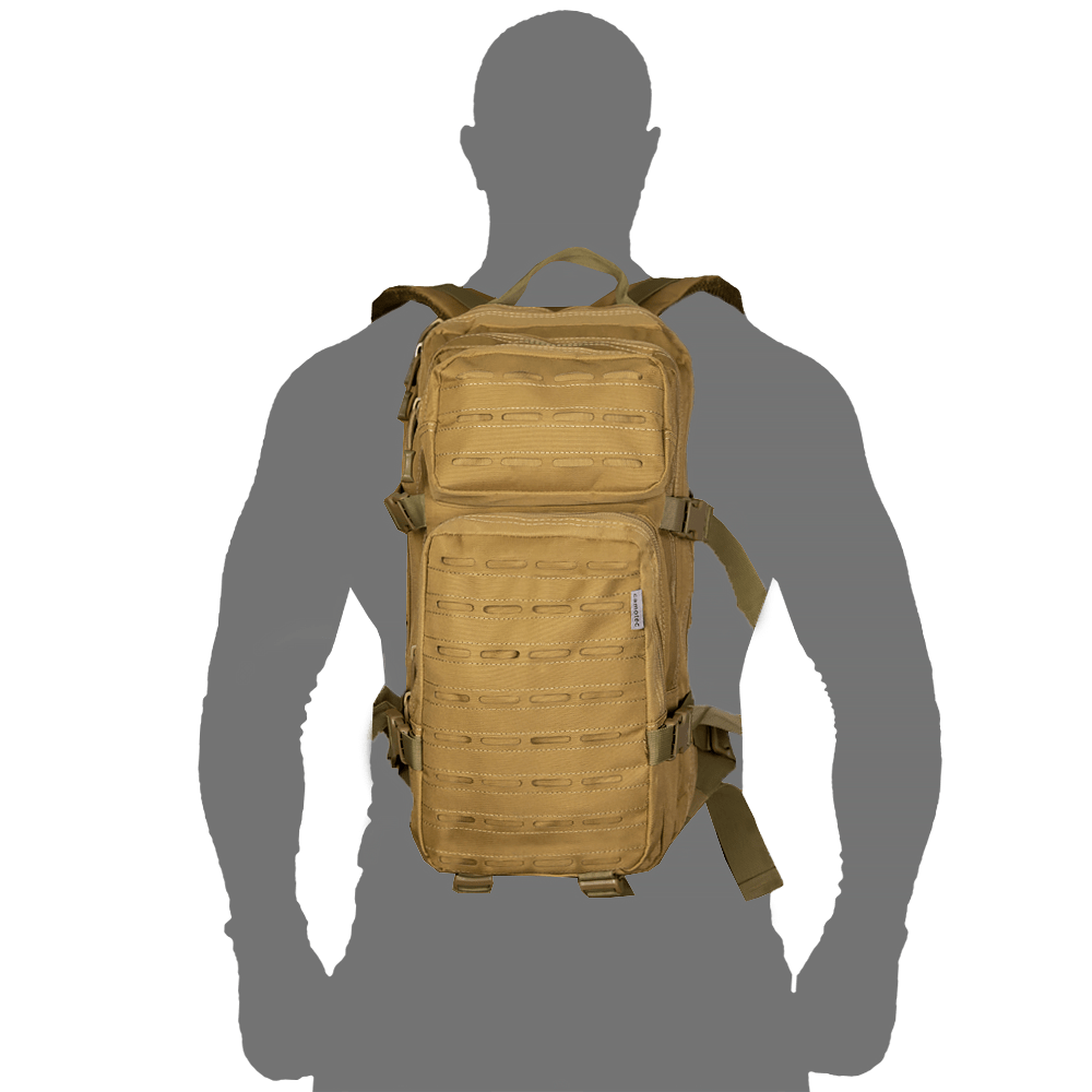 Тактичний рюкзак об'ємом 25 л. Рюкзак має ряд конструктивних особливостей, таких як стропи MOLLE, зроблених за технологією LC (laser cut), пулери на бігунках, D-кільця, а також додаткові лямки для фіксації об'єму (компресійні лямки).