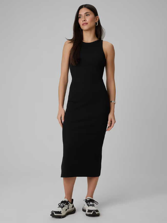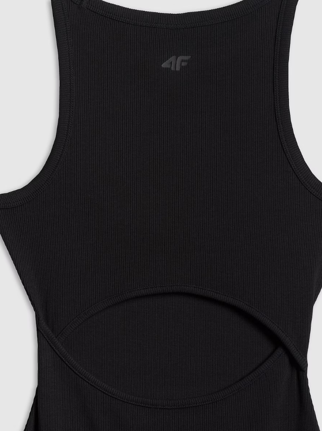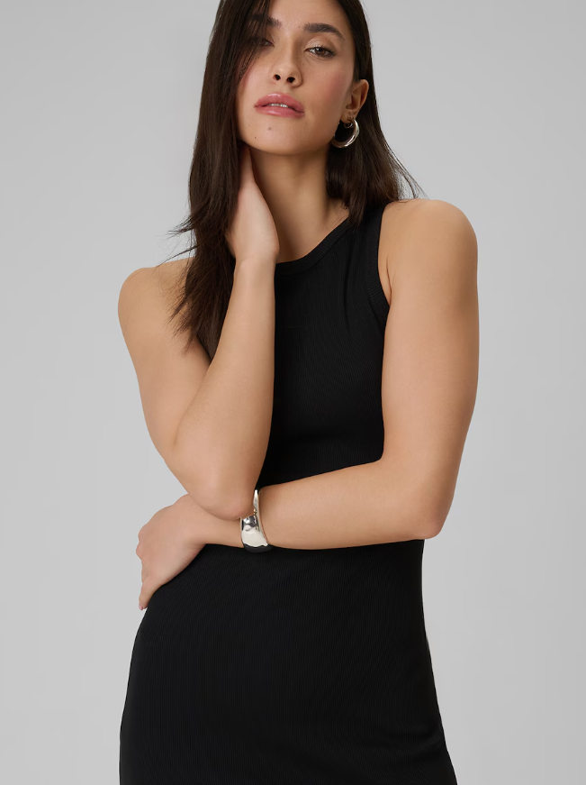 Тканина в рубчик підкреслює силует, створюючи виразний і жіночний вигляд. Округлий виріз природно лягає на шию, забезпечуючи комфорт і естетичність.